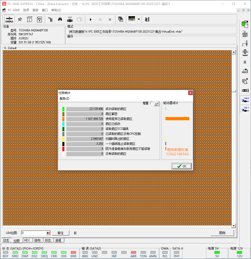 在配件库中到同磁头类型的配件硬盘在PC3000 Seagate专修程序里对故障盘ROM与配件进行磁头适配,并在无尘室中对故障盘磁头更换调试等操作成功,磁头更换成功,使用TOSHIBA专修程序通电加载查看COM口终端,等待适配成功后读取核心固件模块,等固件修复成功,使用PC3000 Data Extractor建立磁头位图并进行数据恢复成功.