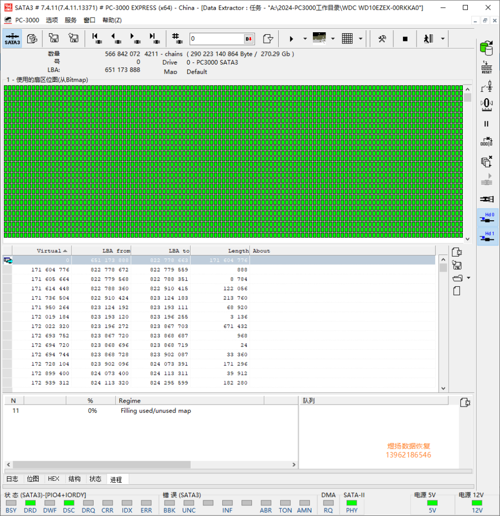 我们接到硬盘接入pc3000端口硬盘检测有大量坏块工程师启动PC3000 WD专修模块进行固件加载并修复翻译器模块成功,启动PC3000 Data Extractor建立磁头位图并进行数据提取与数据镜像操作,耗时一天成功镜像客户全部数据。